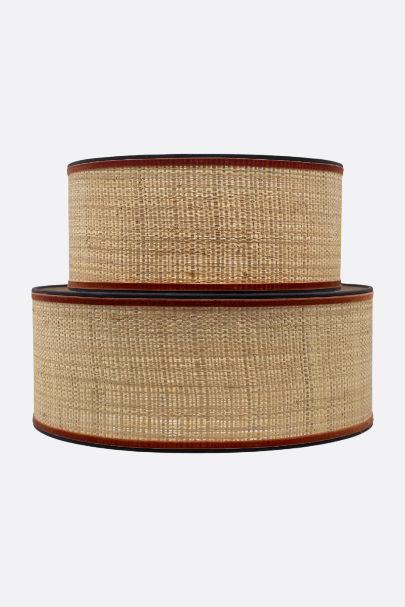 Pantalla de techo formada por 2 cilindros de rafia con cinta de terciopelo.