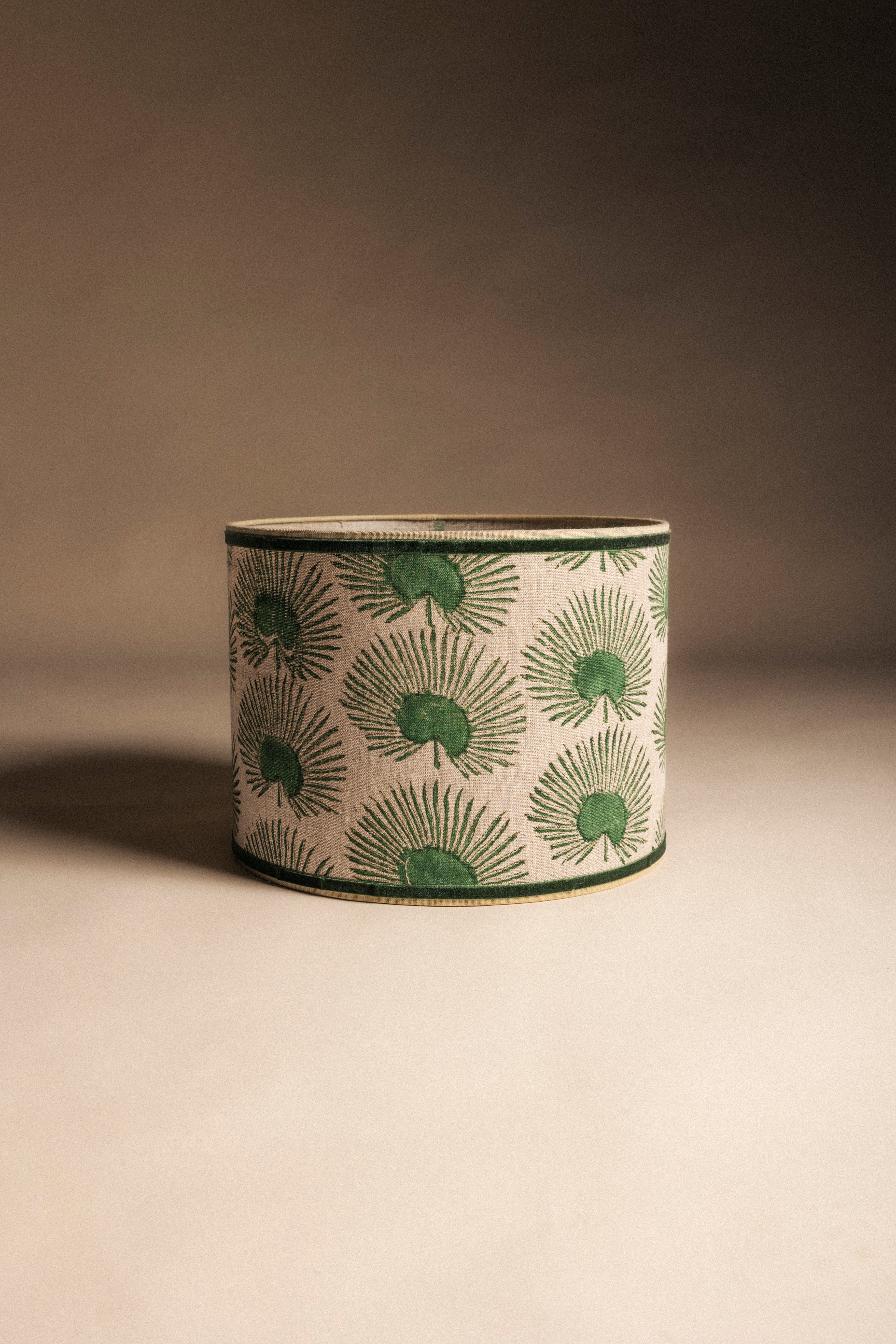 Pantalla cilíndrica de lino, acabado en cinta de terciopelo.