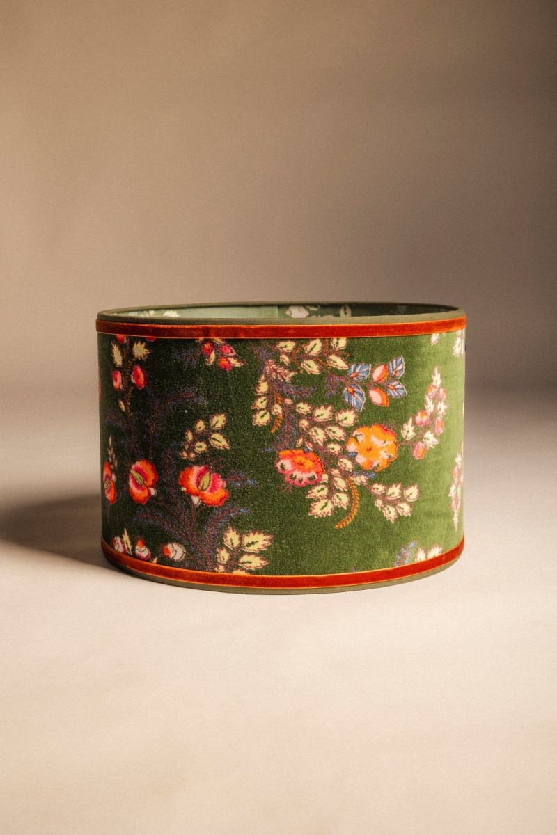 Pantalla cilíndrica de terciopelo, acabado en cinta de terciopelo.
