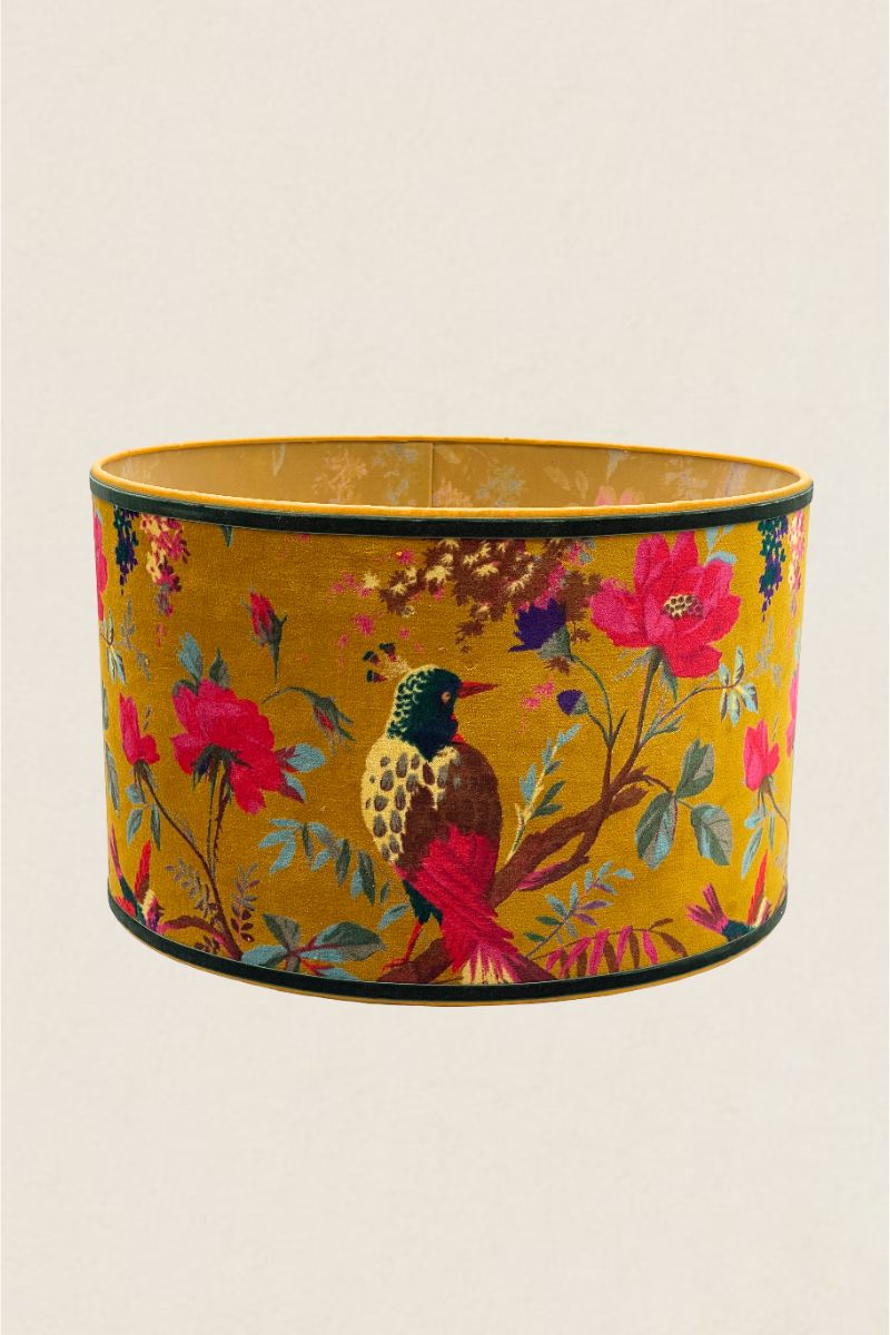Pantalla cilíndrica de terciopelo, acabado con cinta de terciopelo.