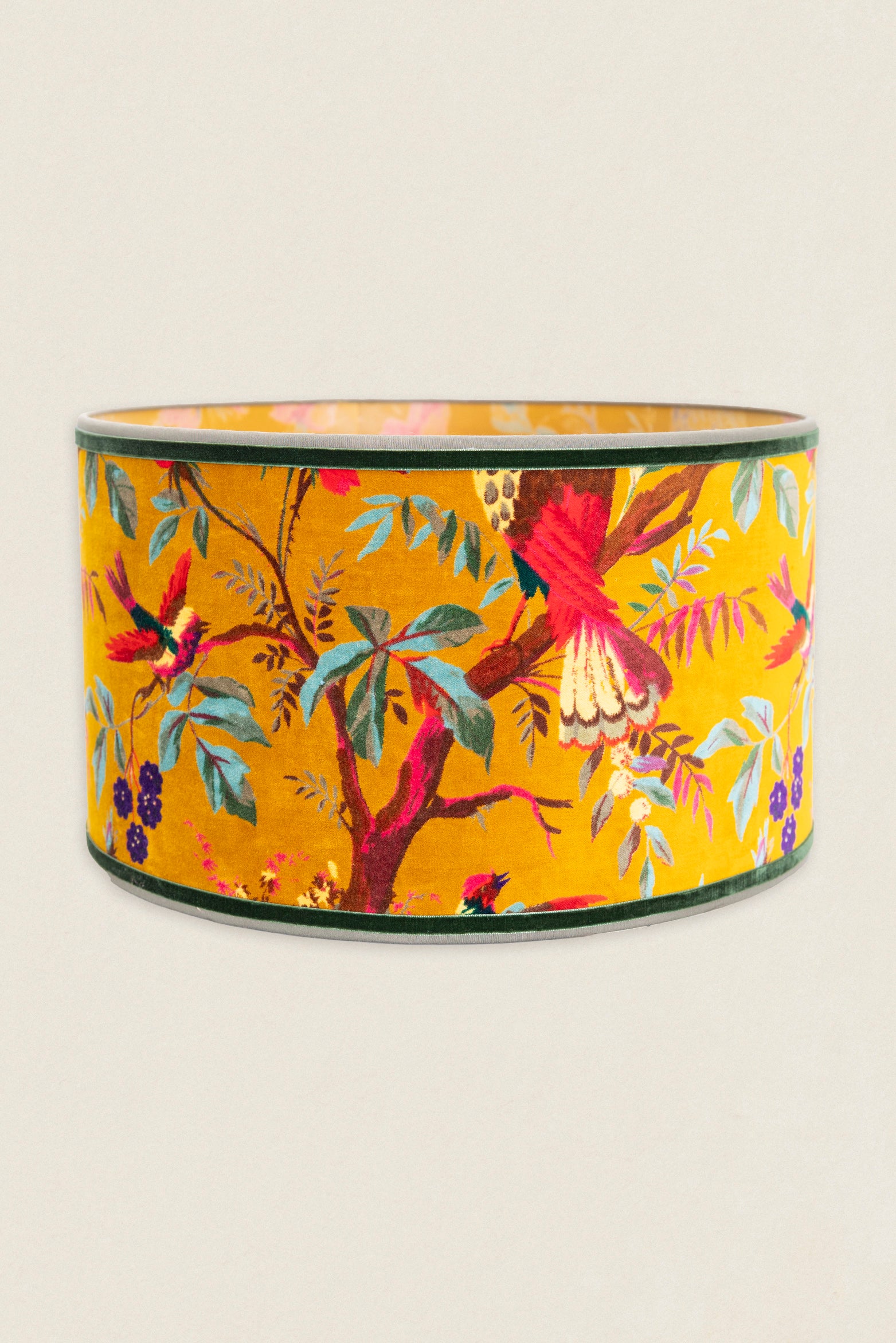 Pantalla cilíndrica de terciopelo, acabado con cinta de terciopelo.