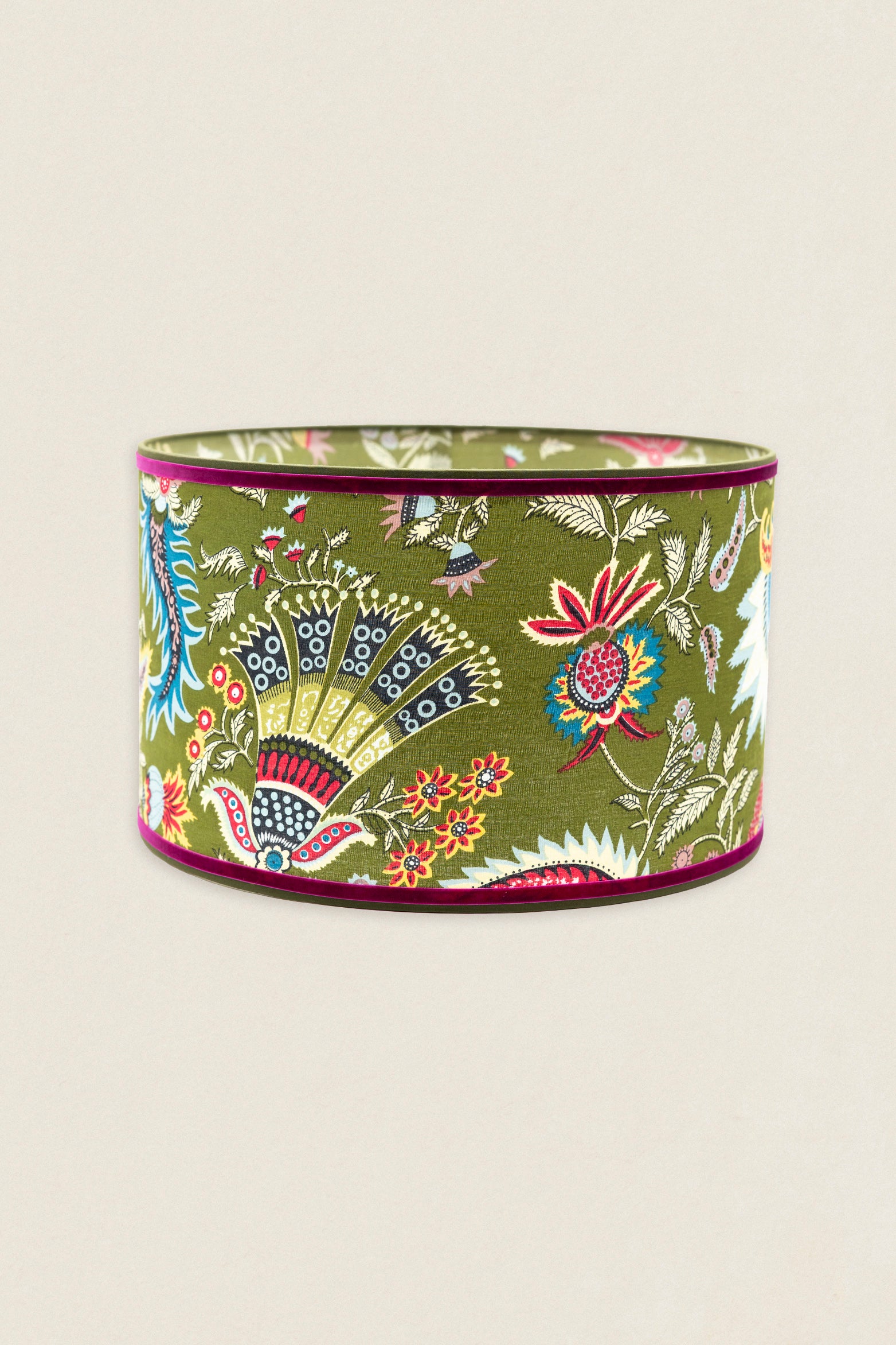 Pantalla Cilindro de algodón, acabado con cinta terciopelo.