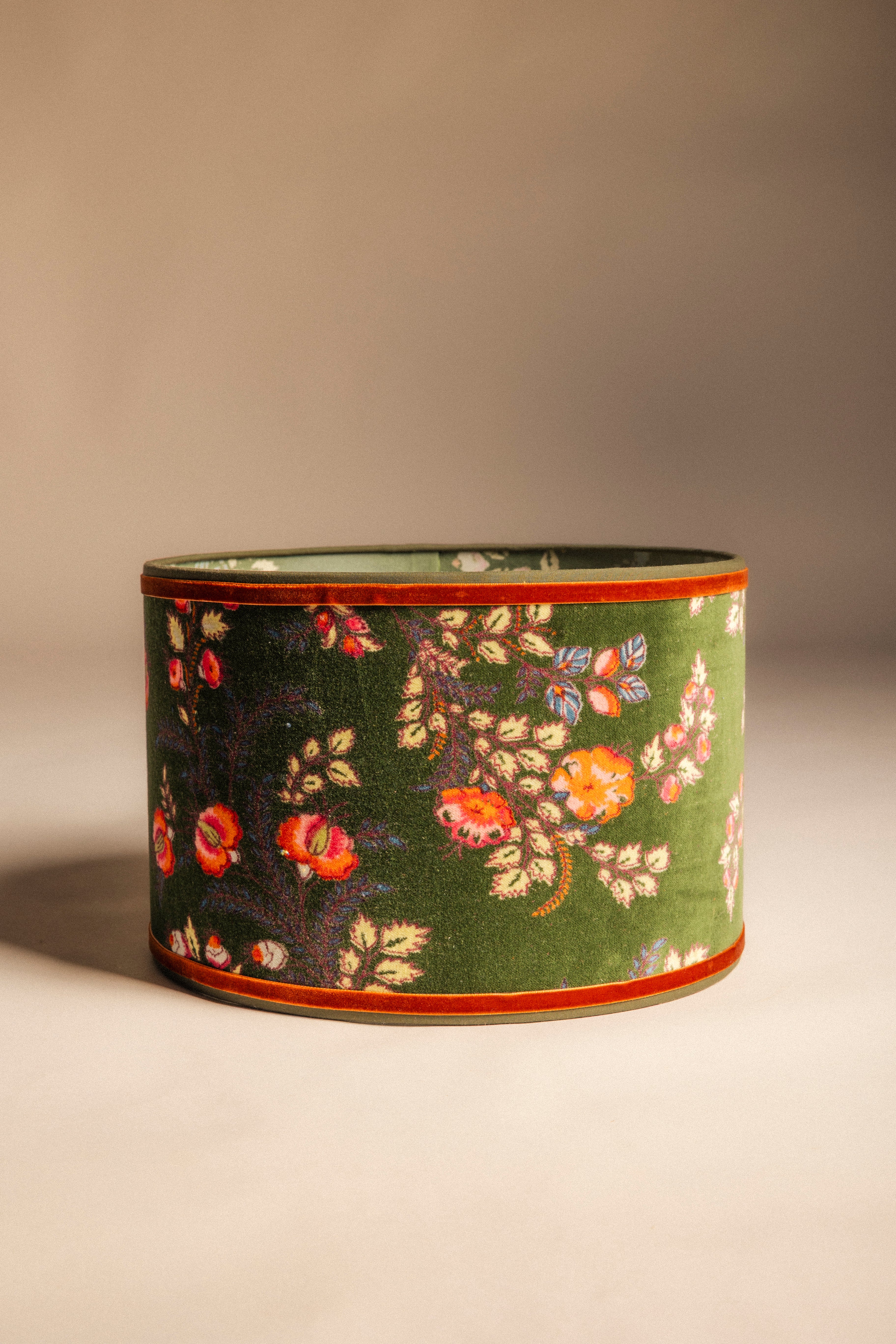 Pantalla cilíndrica de terciopelo, acabado en cinta de terciopelo.