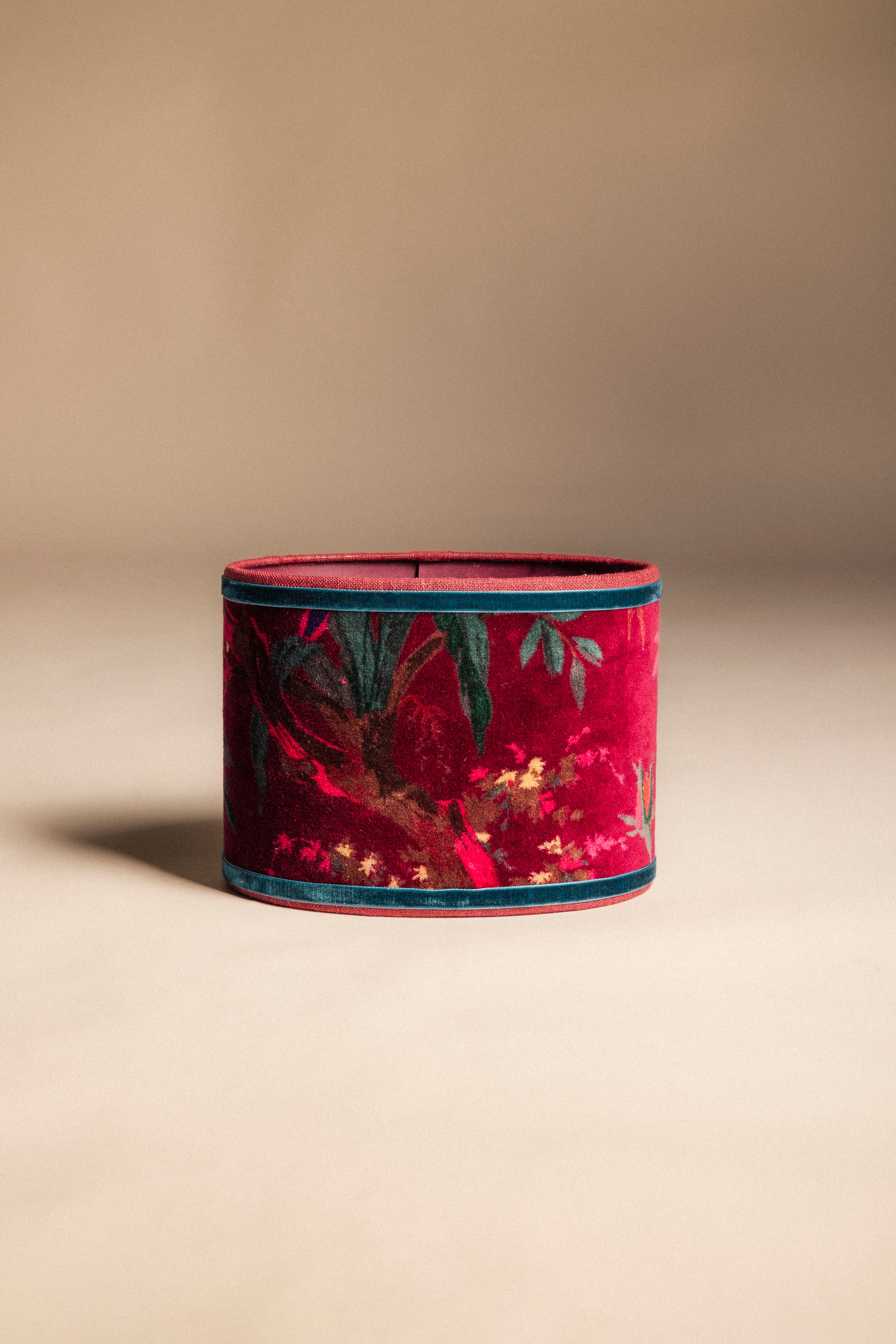 Pantalla ovalada de terciopelo, acabado en cinta de terciopelo.