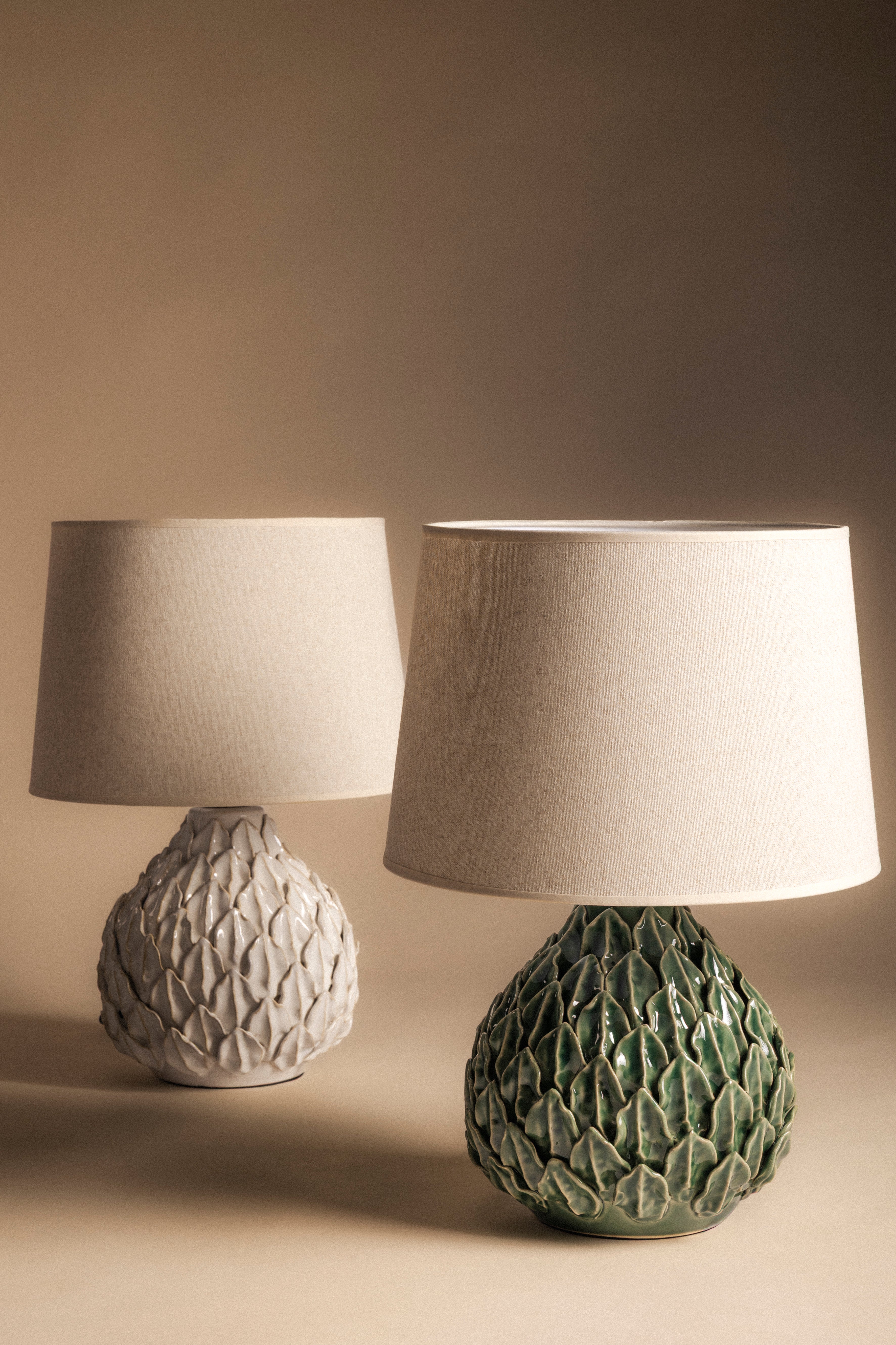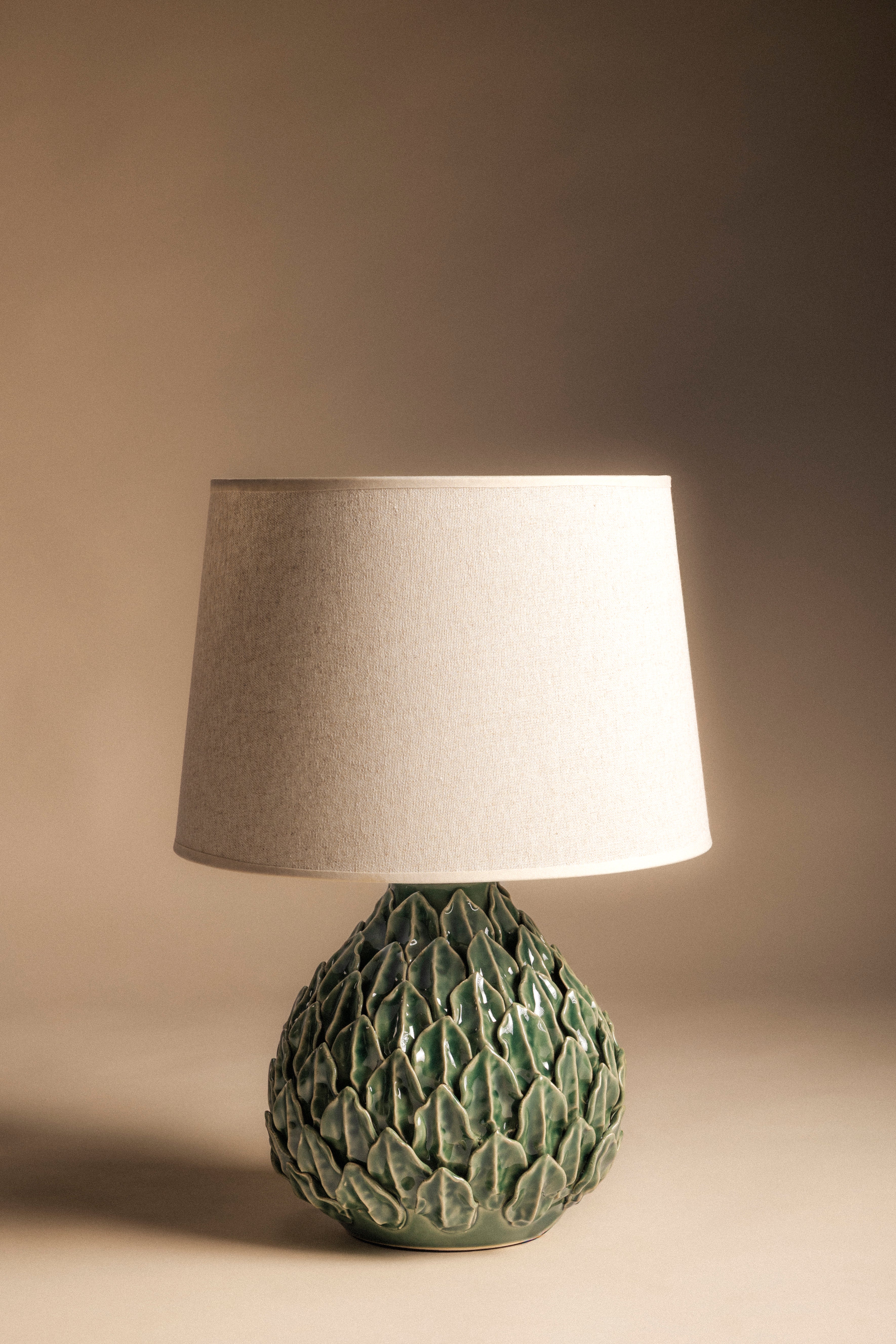 Lámpara de cerámica esmaltada con hojas decorativas, pantalla de lino incluida.