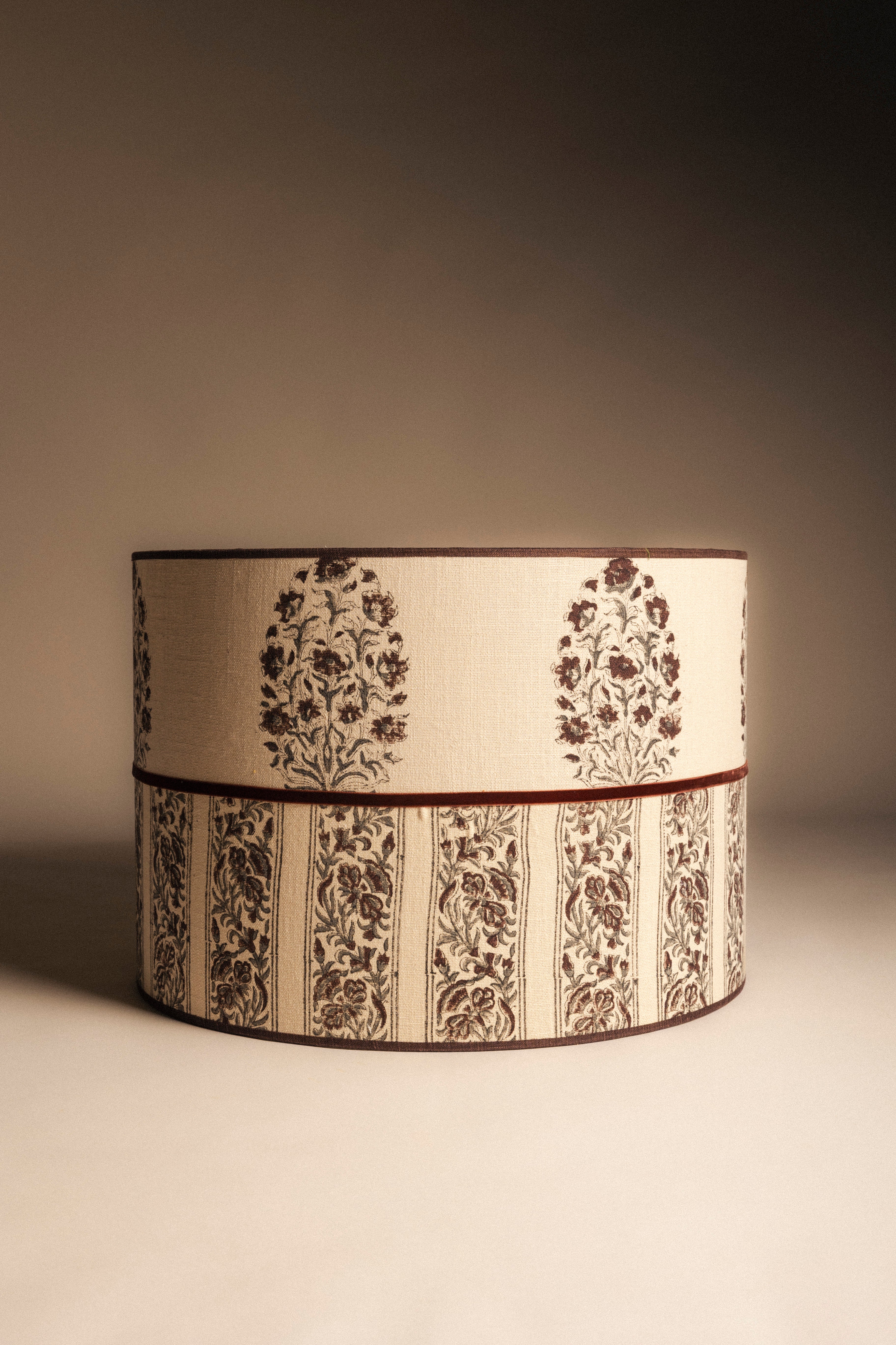Pantalla cilíndrica confeccionada en 2 tejidos de lino diferentes, acabada con cinta de lino y de terciopelo. Ideal para pies de lámpara de gran tamaño.