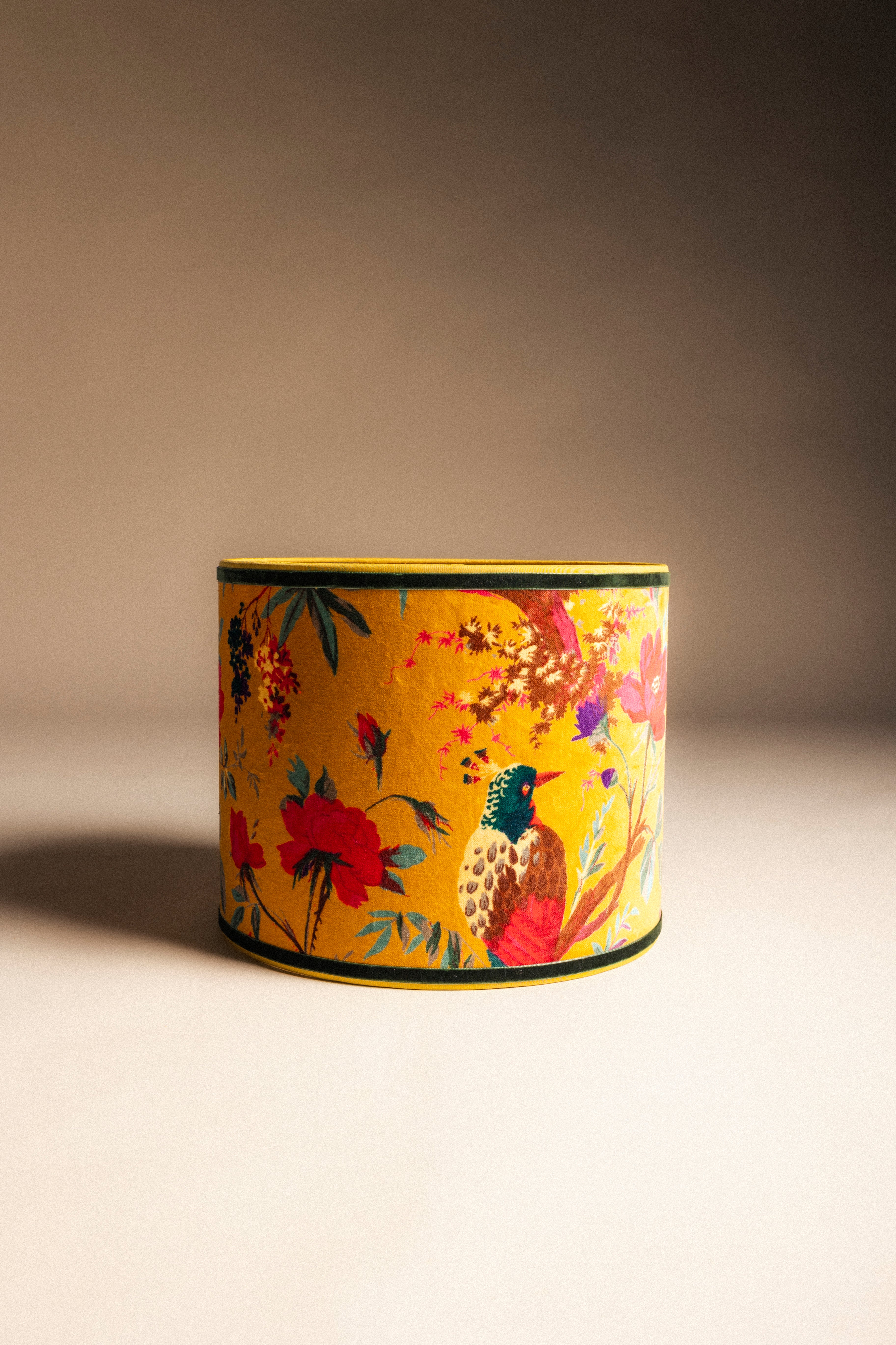 Pantalla cilíndrica confeccionada en terciopelo, acabada con cinta de Terciopelo.