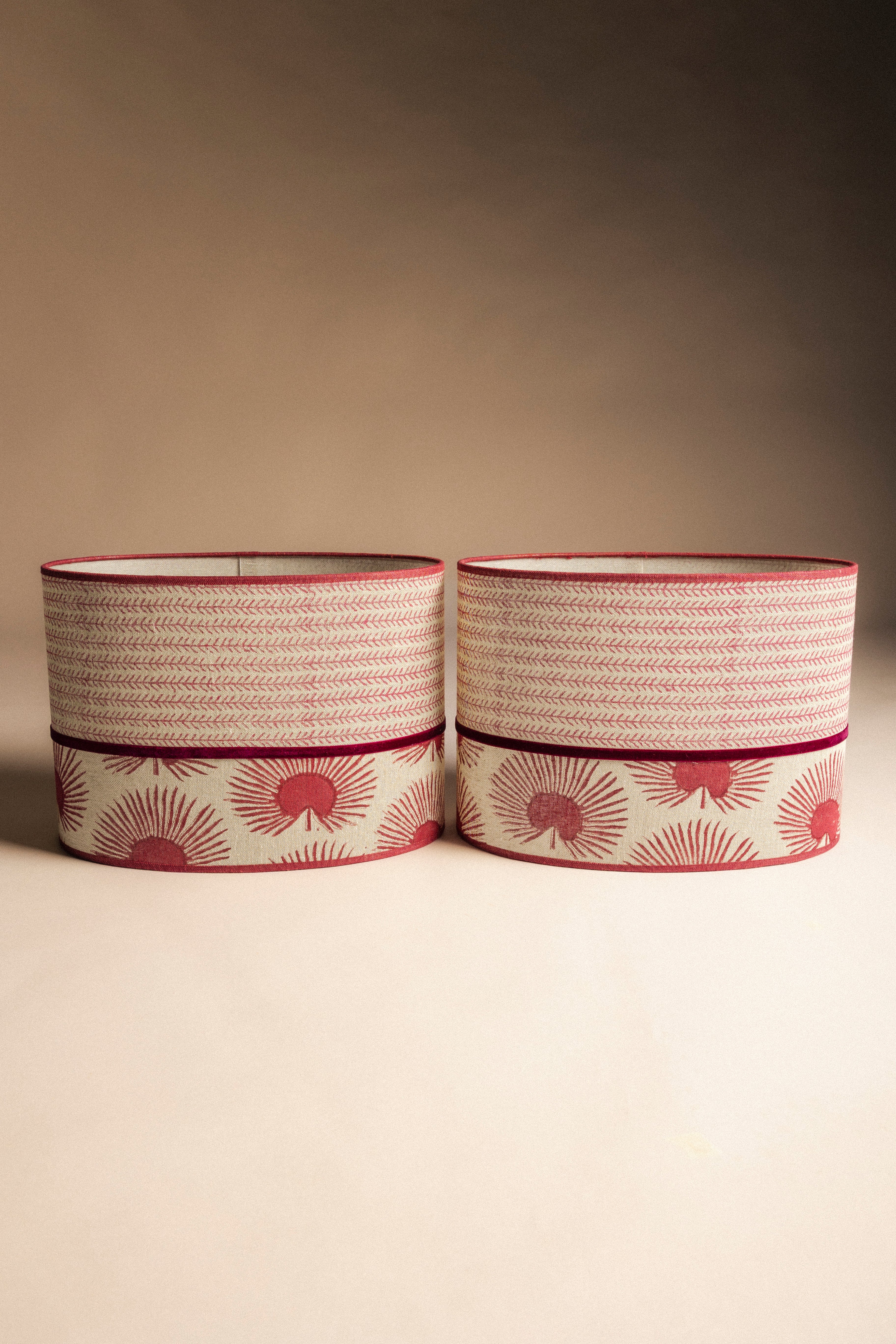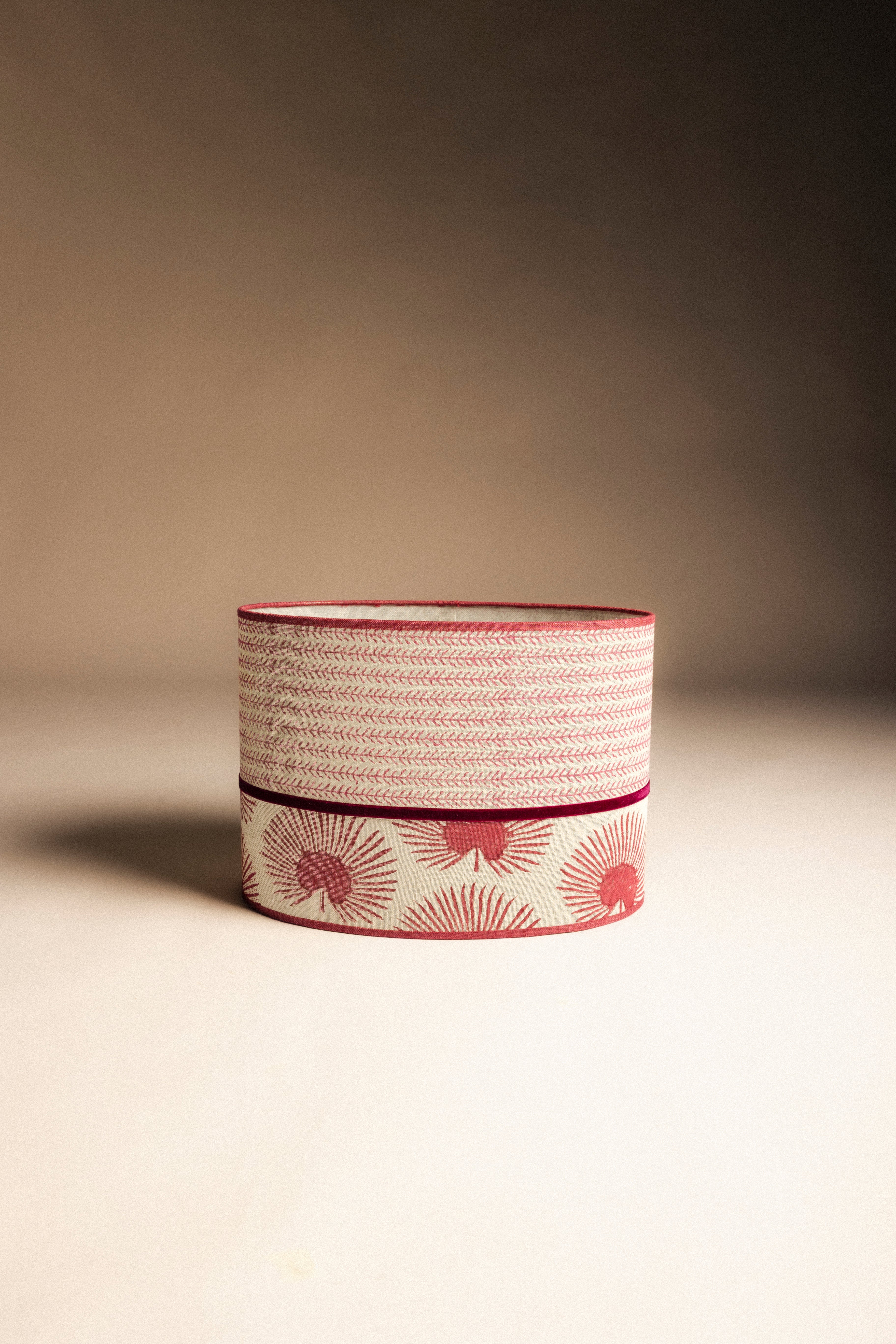 Pantalla ovalada confeccionada en 2 tejidos de lino diferentes, acabada con cinta de lino y de terciopelo.