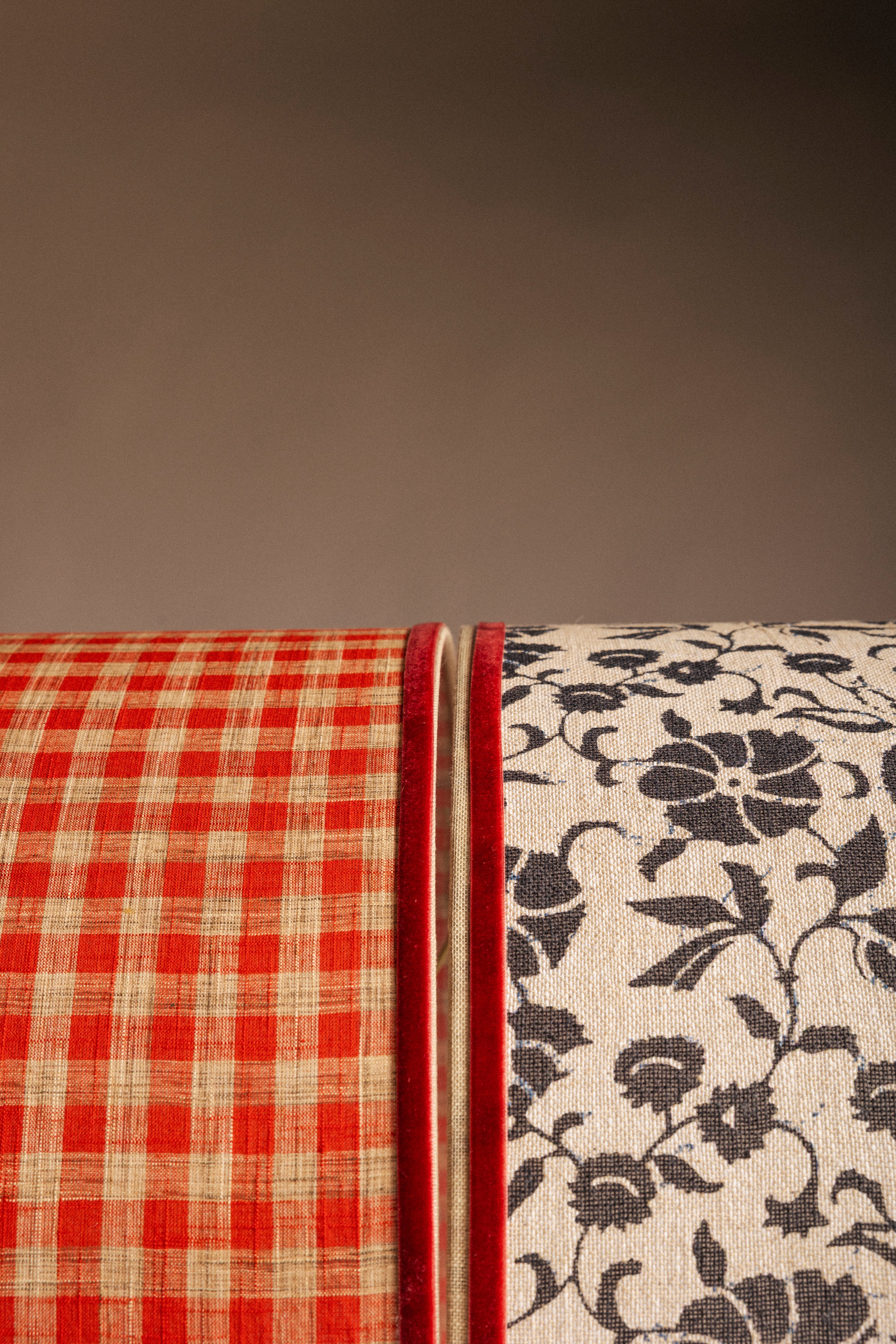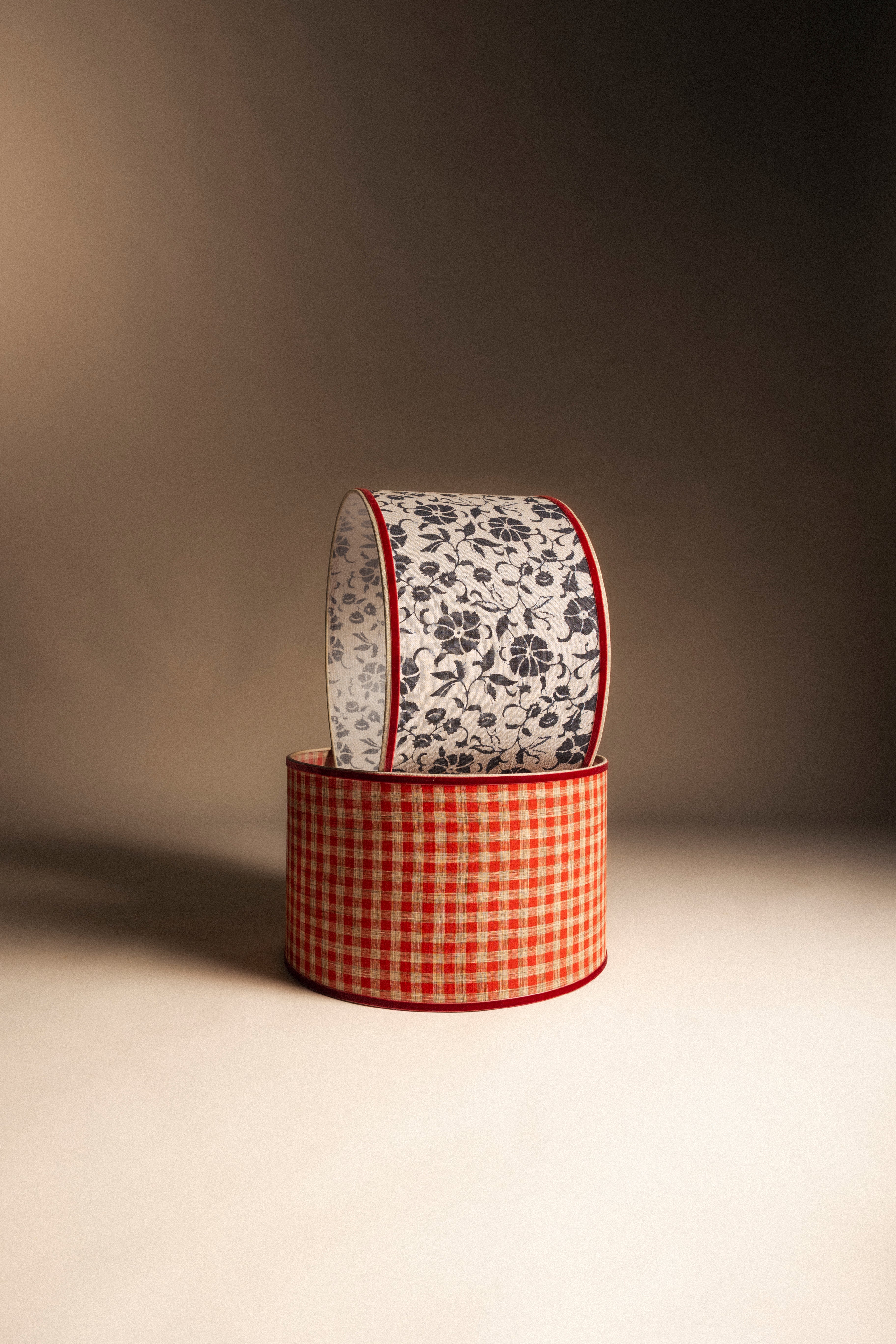 Pantalla cilíndrica de lino, acabado en cinta de terciopelo.