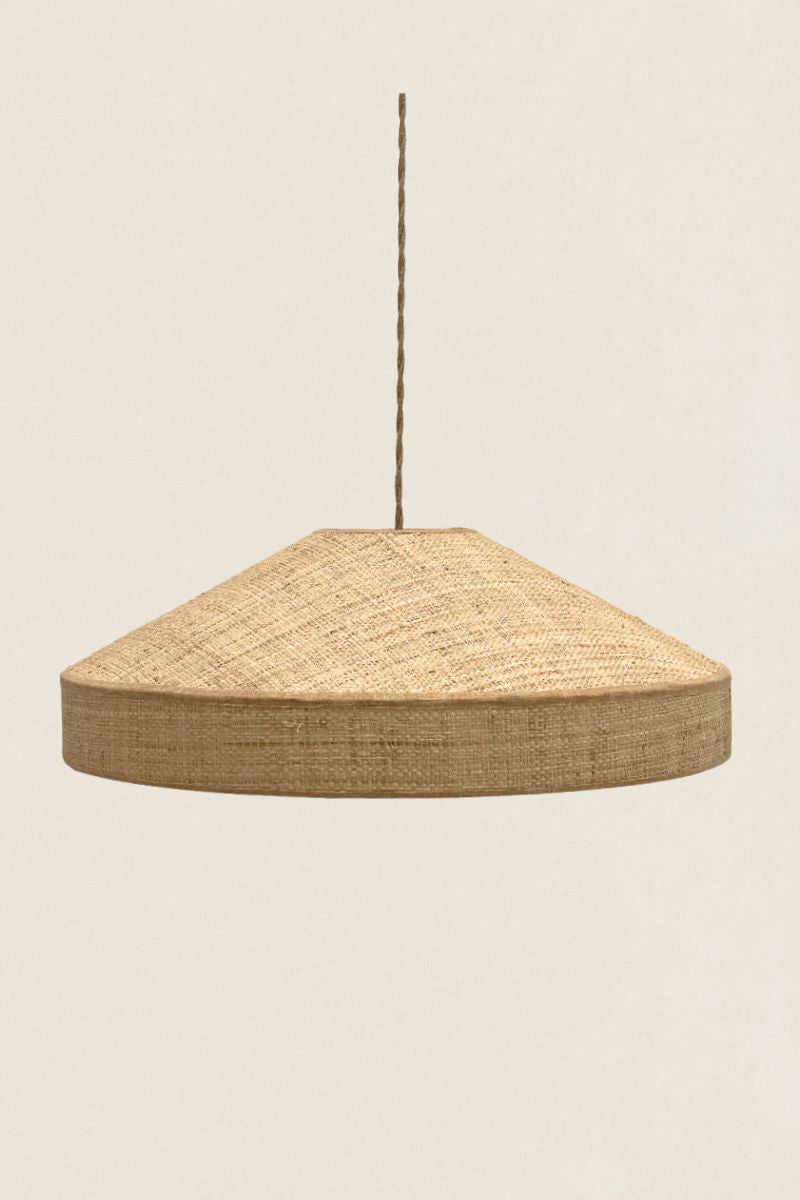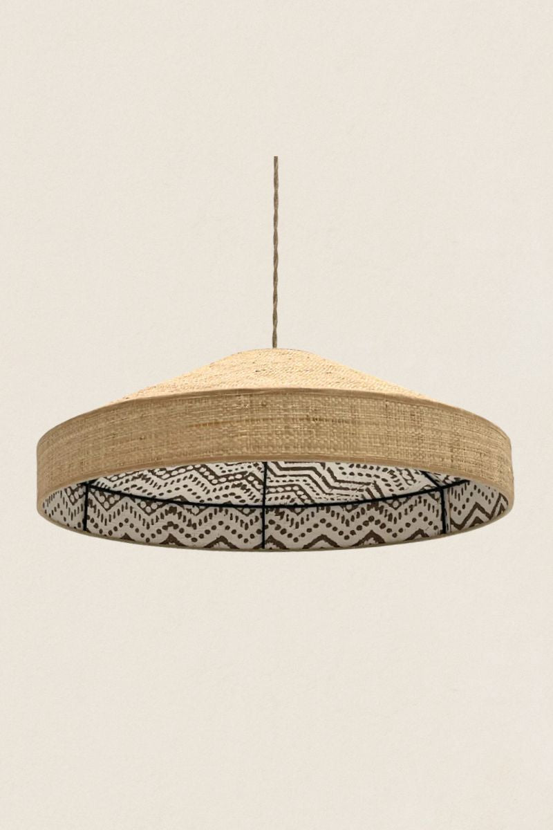 Lámpara de techo exterior rafia e interior tejido de algodón con relieve, cinta de lino.