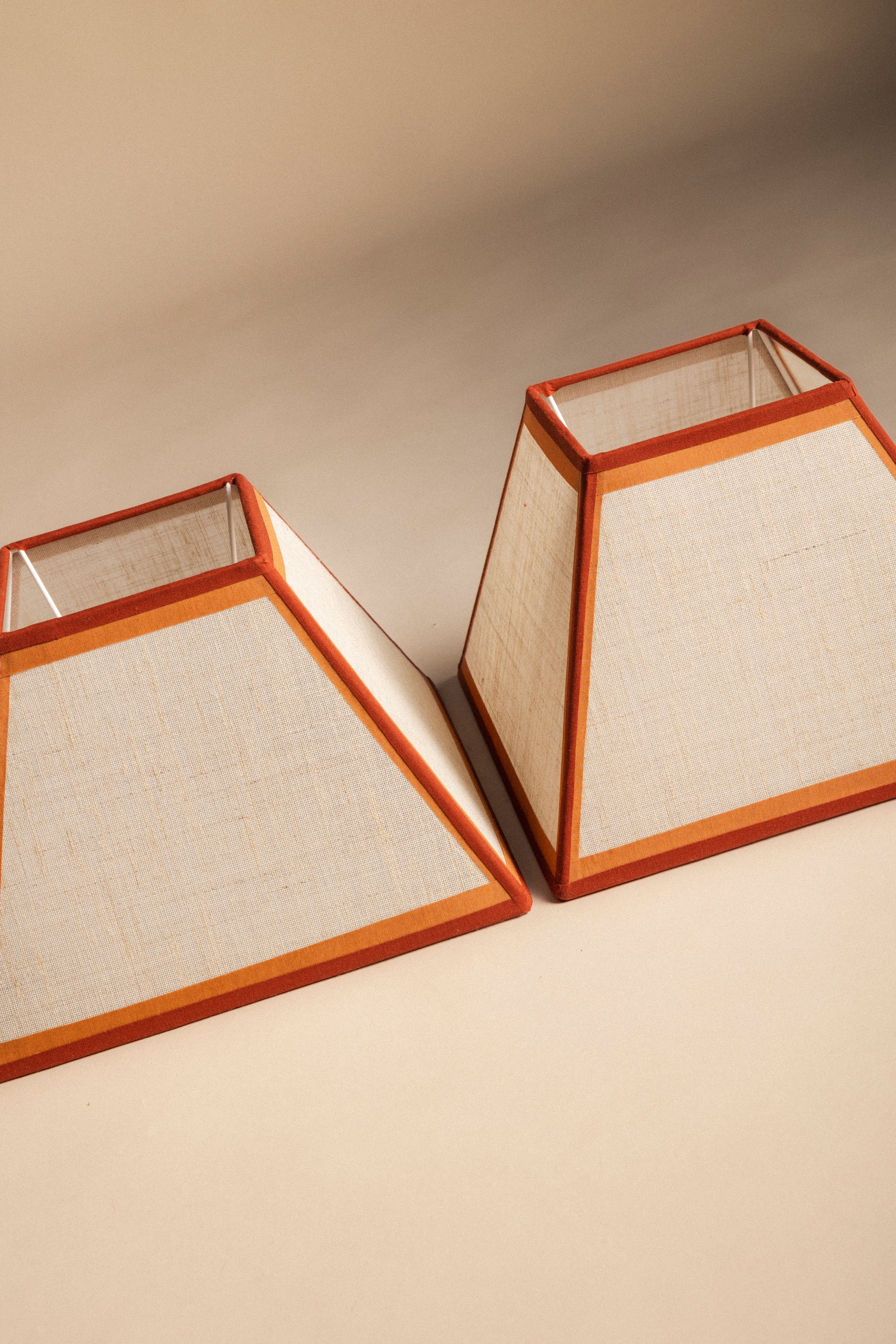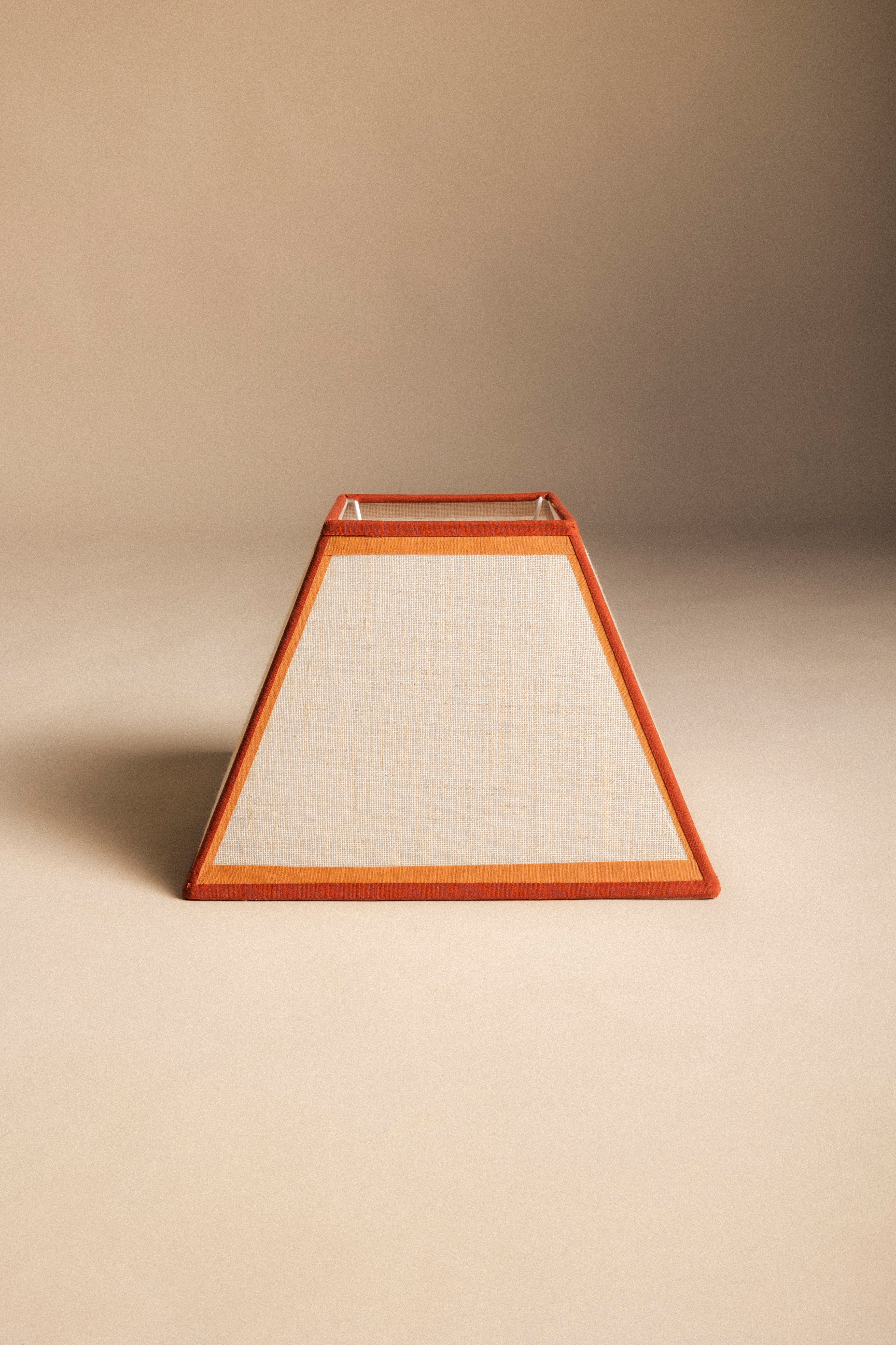Pantalla cuadrada trapecio confeccionada en lino tostado, acabada con doble cinta de algodón en tonos caldera